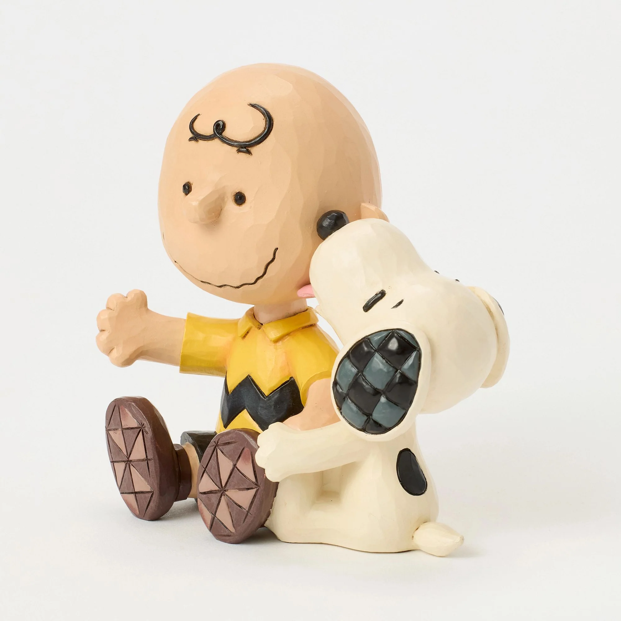 Jim Shore shares a tender scene of Charlie Brown and Snoopy as they sit side by side. Charlie smiles peacefully as Snoopy lovingly licks his cheek. Jim Shore's signature patchwork patterning adds childlike nostalgia to this sweet celebration of love. Dimensions: H 11.0 x L 11.0 x W 6.0 cm